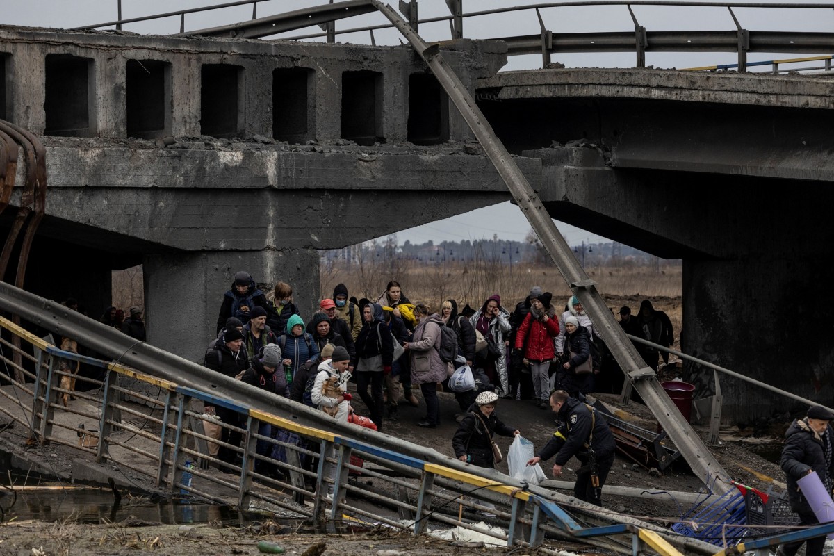 Local residents cross a destroyed bridge as they evacuate from the town of Irpin, after days of heavy shelling on the only escape route used by locals, while Russian troops advance towards the capital, in Irpin, near Kyiv, Ukraine March 7, 2022. Photo: Reuters/Carlos Barria