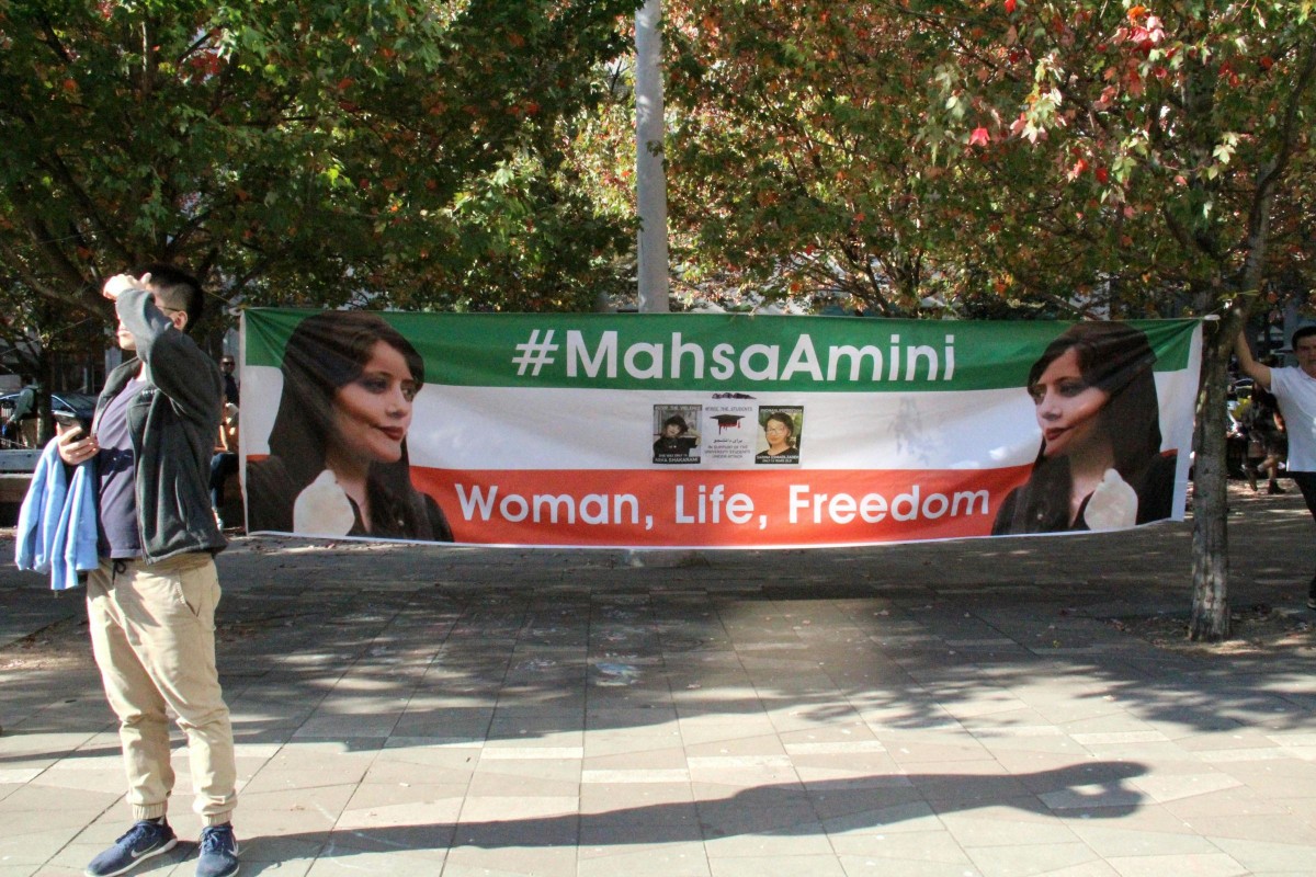 Protestors holding a sign in support of Mahsa Amini. Photo: Simi Ghaffarzadeh