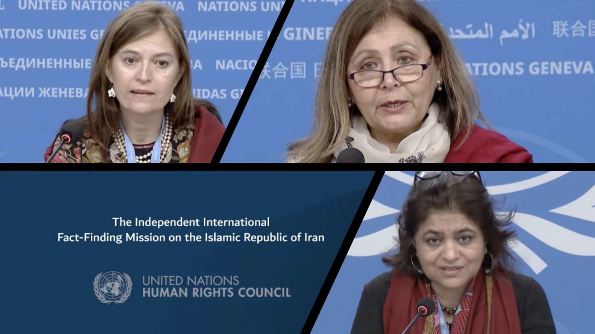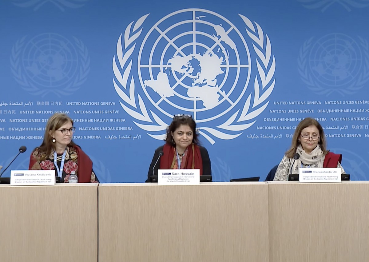 UNHRC Investigative Iran panel (left to right) Viviana Krsticevic, Sara Hossain, Shaheen Sardar Ali. Photo: Screenshot from UN press conference