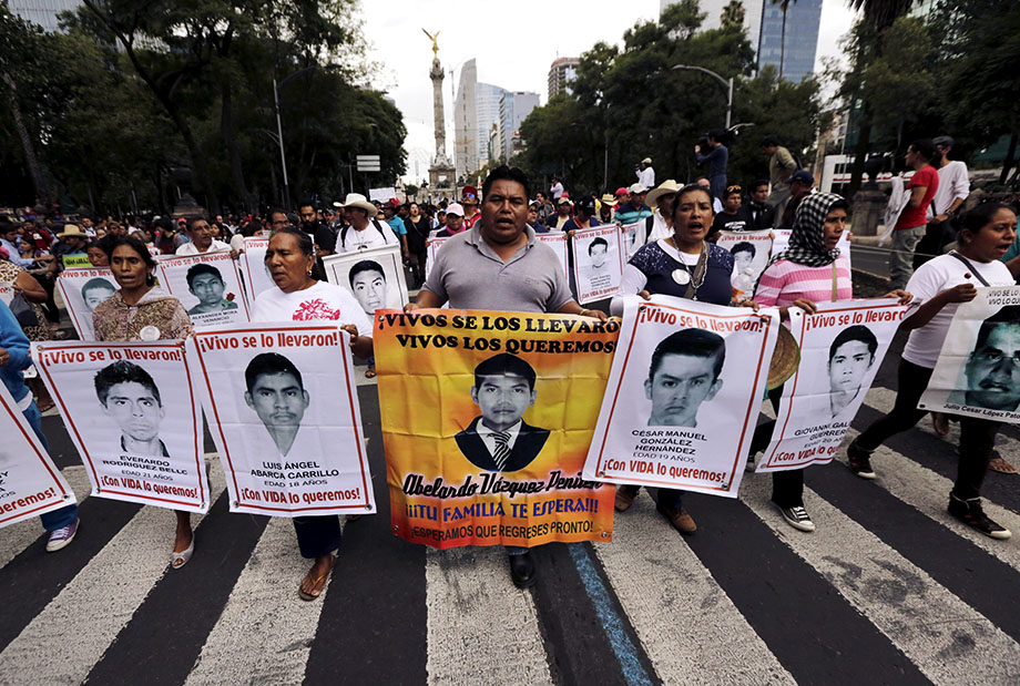 Relatives carry photos of some of the 43 missing students of the Ayotzinapa teachers' training college during a protest to mark the 11-month anniversary of their disappearance in Mexico City, Aug. 26, 2015. Credit: Reuters