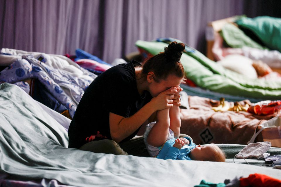 A woman plays with her child in a sports hall of a high school, transformed into temporary accommodation for people fleeing the Russian invasion of Ukraine, in Przemysl, Poland, March 9, 2022. Photo: Reuters/Yara Nardi