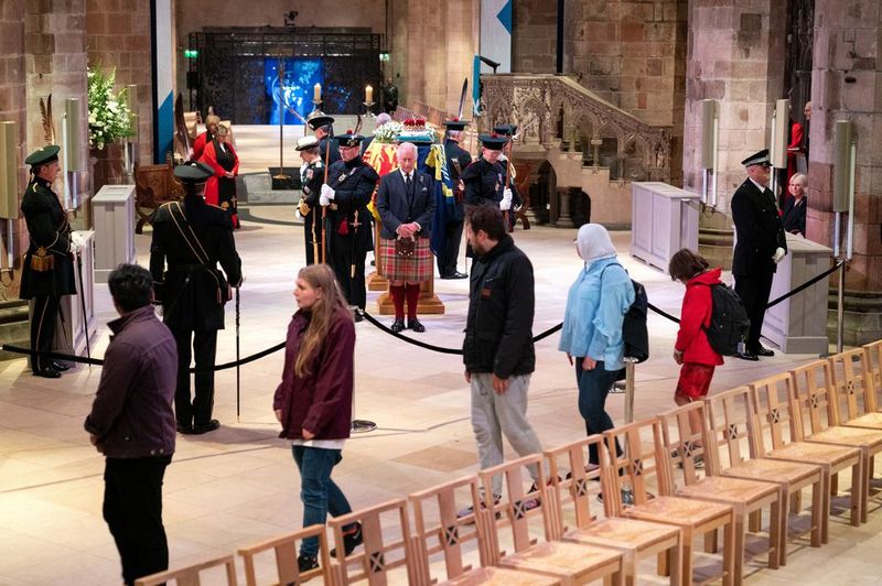 Television footage showed people filing slowly past the coffin, which was draped in the Royal Standard of Scotland flag and topped with a wreath of white flowers and the Crown of Scotland, historically used for the coronations of monarchs of Scotland. Some stopped to bow as they passed, and others wiped away tears.