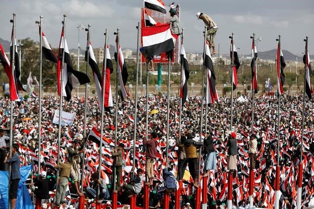 Supporters of the Houthi movement and Yemen's former president Ali Abdullah Saleh climb flag poles as they attend a joint rally to mark two years of the military intervention by the Saudi-led coalition, in Sanaa, Yemen March 26, 2017. Credit: Reuters