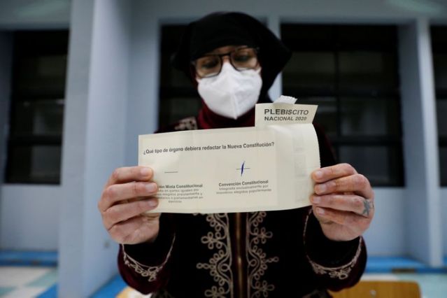 A poll worker wearing a protective mask shows a vote for a constitutional convention during a referendum on a new Chilean constitution, in Valparaiso, Chile October 25, 2020. Photo: Reuters/Rodrigo Garrido