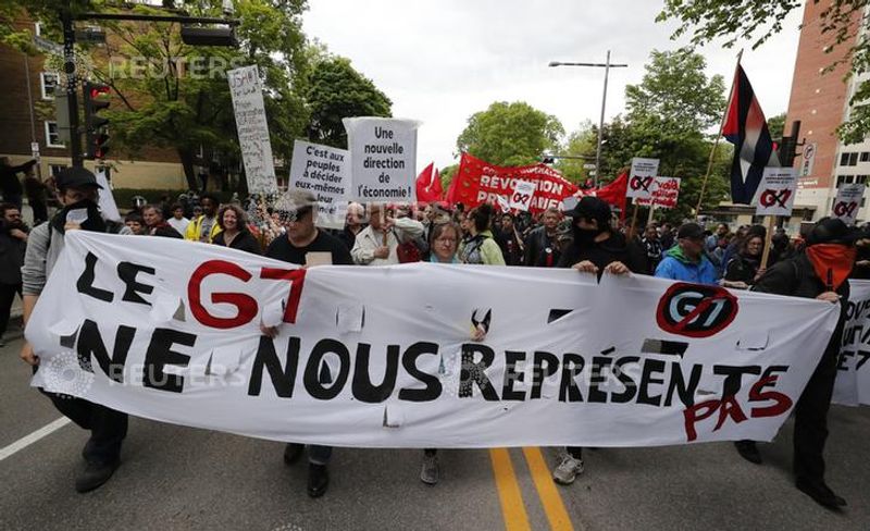 Some in the crowd, closely watched by riot police, carried banners with slogans such as "The G7 does not represent us." Others carried posters with defaced photos of Trump.