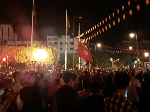Avenue Habib Bourguiba was the very site where a mass protest against the Mechichi regime had been called in the morning of July 25, 2021; the intense police barricading of the site as well as the rest of Tunis meant that the protest was not held only at this site. Mechichi, who had been designated the prime minister by the president a year ago, had come to be seen as incompetent in the face of economic and health crisis in Tunisia, and as someone who supported the use of security forces against protesters. In the evening, the avenue was filled with a cheering crowd whose main demands seemed to have been fulfilled.