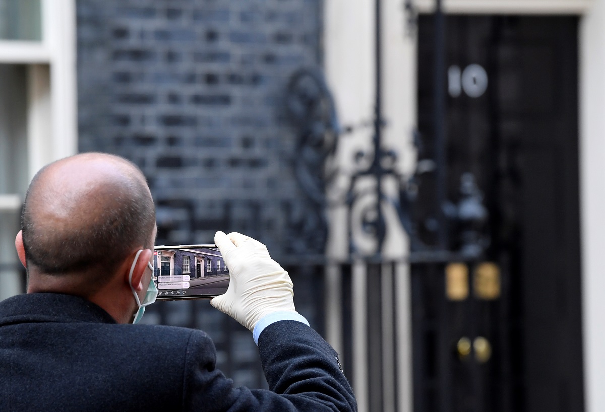 A journalist films the front of 10 Downing street after Britain's prime minister Boris Johnson tested positive for the coronavirus disease, in London, March 27, 2020. Photo: REUTERS/Toby Melville