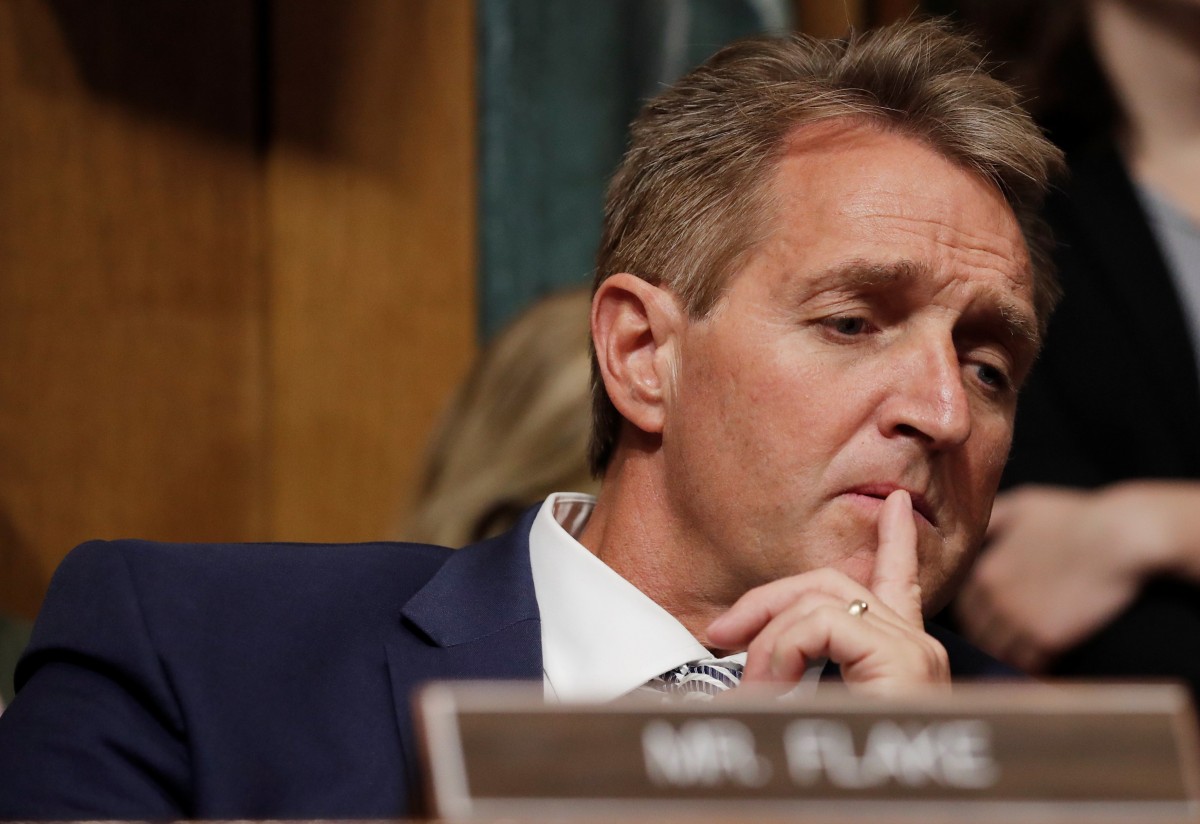 U.S. Senator Jeff Flake (R-AZ) listens as members of the Senate Judiciary Committee meet to vote on the nomination of judge Brett Kavanaugh to be a U.S. Supreme Court associate justice on Capitol Hill in Washington, U.S., September 28, 2018. Credit: REUTERS/Jim Bourg