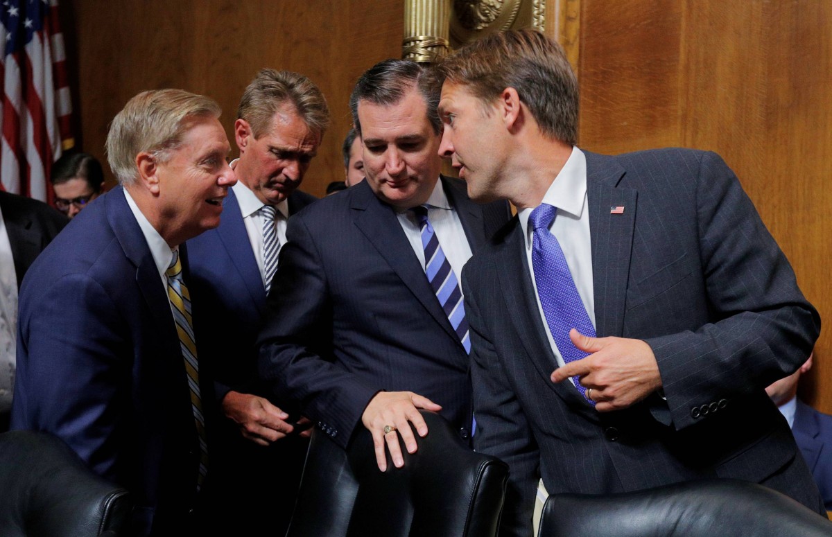 U.S. Senate Judiciary Committee members (L-R) Senator Lindsey Graham, Senator Jeff Flake, Senator Ted Cruz and Senator Ben Sasse leave the committee chamber after the committee voted to move the nomination of U.S. Supreme Court nominee Brett Kavanaugh forward to a full Senate vote after Flake imposed a condition of an FBI investigation on his yes vote during a session on Capitol Hill in Washington, U.S., September 28, 2018. Credit: REUTERS/Jim Bourg