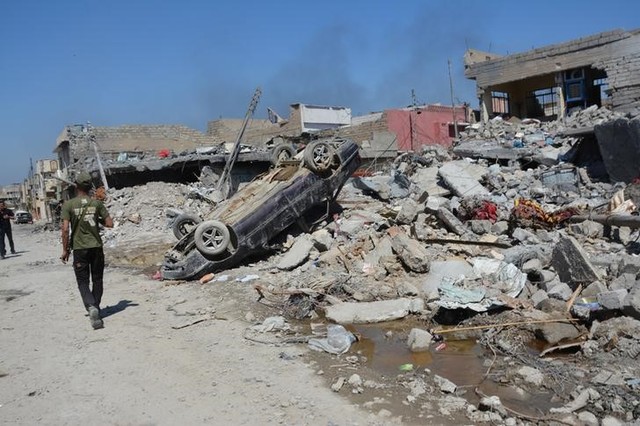 A destroyed car is seen at the site after an air strike attack against ISIS triggered a massive explosion in Mosul, Iraq March 27, 2017. Credit: Reuters