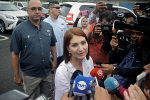 Marta de Martinelli, wife of former Panama president Ricardo Martinelli, speaks to the media while waiting for his extradition from US outside the Panama Pacifico international airport in Panama City, Panama June 11, 2018. Credit: Reuters/Carlos Lemos