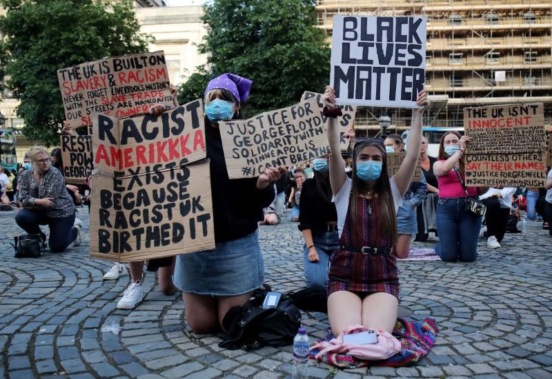 People wearing protective face masks hold up signs during a protest against the death of George Floyd who died in police custody in Minneapolis, Liverpool, Britain, June 2, 2020. REUTERS/Molly Darlington