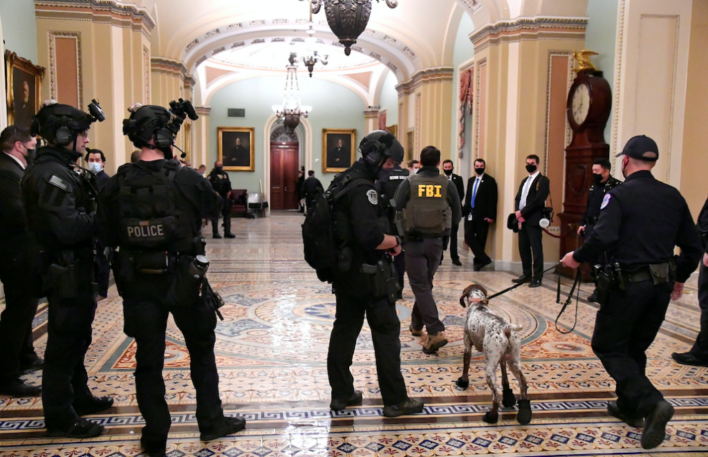 A heavy police force is evident at the Senate door after supporters of President Donald Trump breached security at the US Capitol in Washington, US January 6, 2021. Photo: Reuters/Mike Theiler