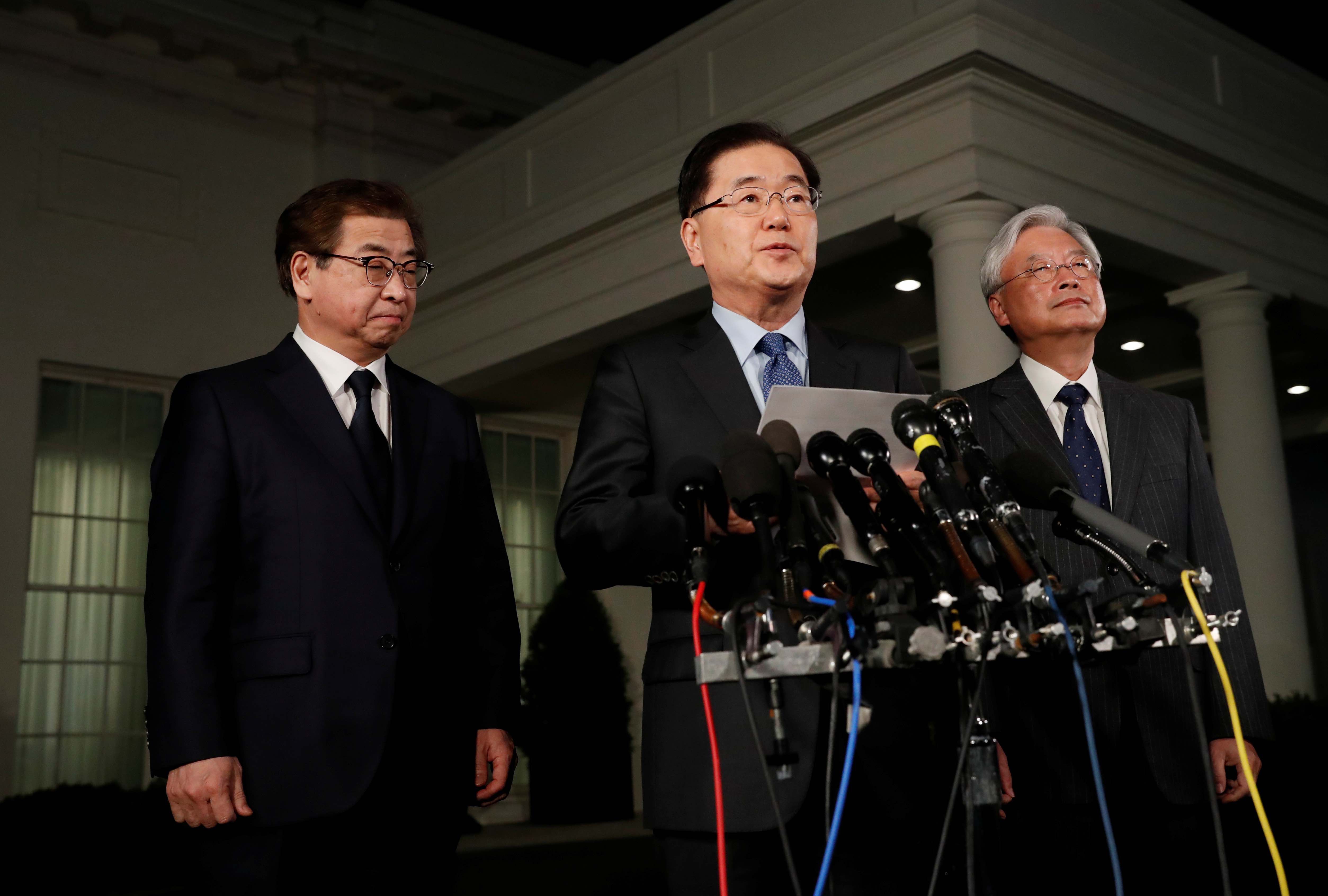 South Korea's National Security Office head Chung Eui-yong, center, and National Intelligence Service chief Suh Hoon, (L), make an announcement about North Korea and the Trump administration outside of the West Wing at the White House in Washington, US March 8, 2018. Credit: Reuters/Leah Millis