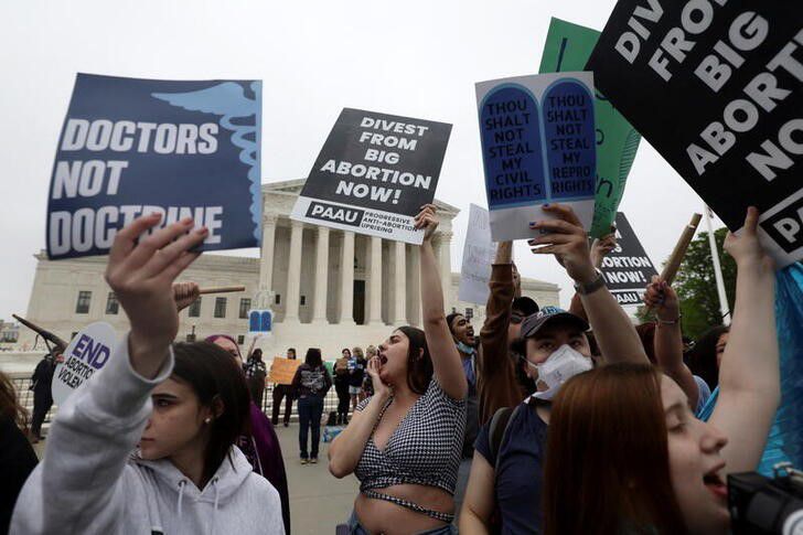 File photo. Demonstrators hold signs during a protest outside the U.S. Supreme Court, after the leak of a draft majority opinion written by Justice Samuel Alito preparing for a majority of the court to overturn the landmark Roe v. Wade abortion rights decision later this year, in Washington, U.S. May 3, 2022. REUTERS/Evelyn Hockstein