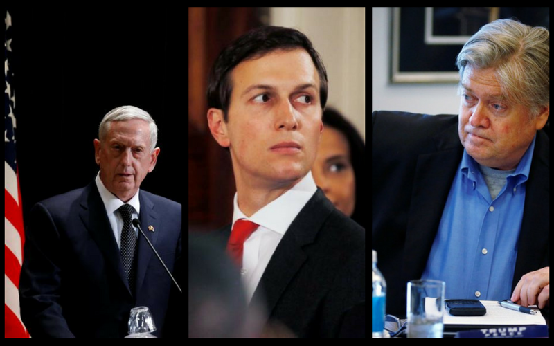 From the left, Jim Mattis, Jared Kushner and Steve Bannon. Bannon is on the backfoot as pushes him out increasingly. Credits: Reuters