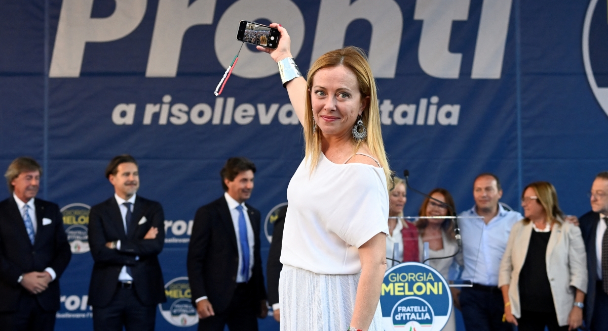 Giorgia Meloni, leader of the far-right Brothers of Italy party, takes a selfie during a rally in Duomo square ahead of the September 25 snap election, in Milan, Italy, September 11, 2022. Photo: Reuters/Flavio Lo Scalzo