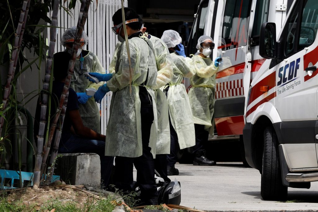 Medical personnel stand behind a migrant worker as they wait to assist him onto an ambulance at a dormitory in Singapore, April 28, 2020. Photo: REUTERS/Edgar Su