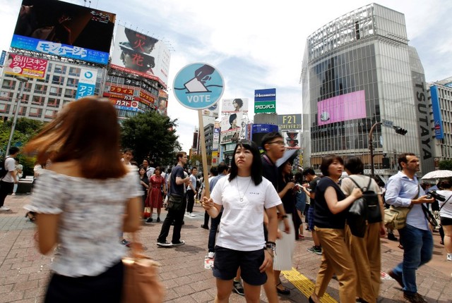 A member of the Students Emergency Action for Liberal Democracy holds a placard calling on youths to vote in the July 10 upper house election, in front of a busy crossing in Shibuya district in Tokyo, Japan, June 26. Credit: Reuters/Toru Hanai